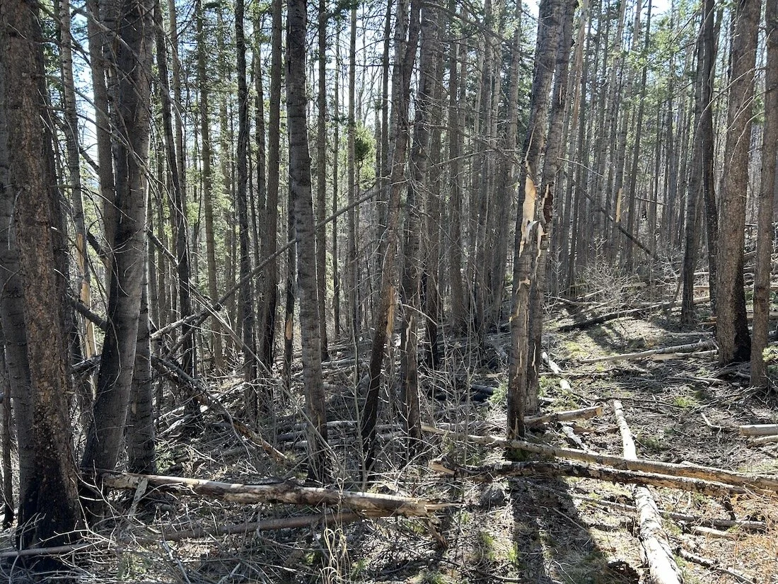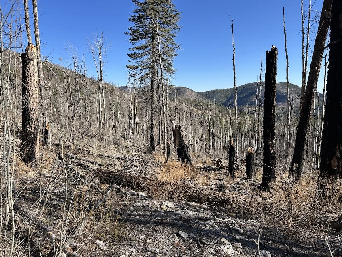 I struggled to find a safe place to camp that night; I did not want to camp beneath a dead tree in the event the wind picked up, but nearly all of them seemed to be. Eventually I found a small patch of living trees and pitched my tent. These ponderosa towered over the rest of what remained of the burnt forest; they felt like a sanctuary and the elk seemed to think so too, as several bands of them trotted through my campsite over the course of the evening.