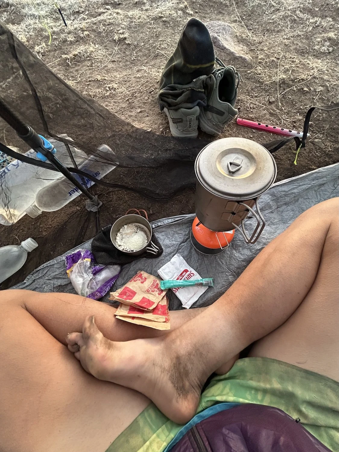 When I reached a sheltered arroyo, I pitched my tent directly in its center. Wind and dust and sand had pummeled me all day and I was eager for a reprieve. I used the smelly water to cook dinner and was pleased to find the ramen flavor packet overpowered the eggyness almost entirely.