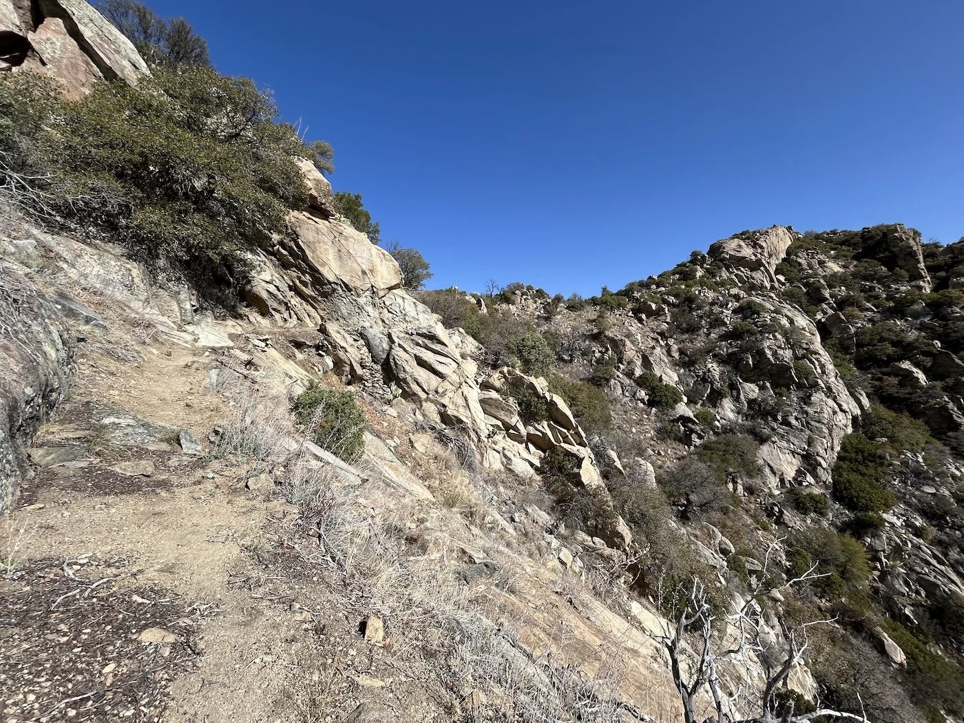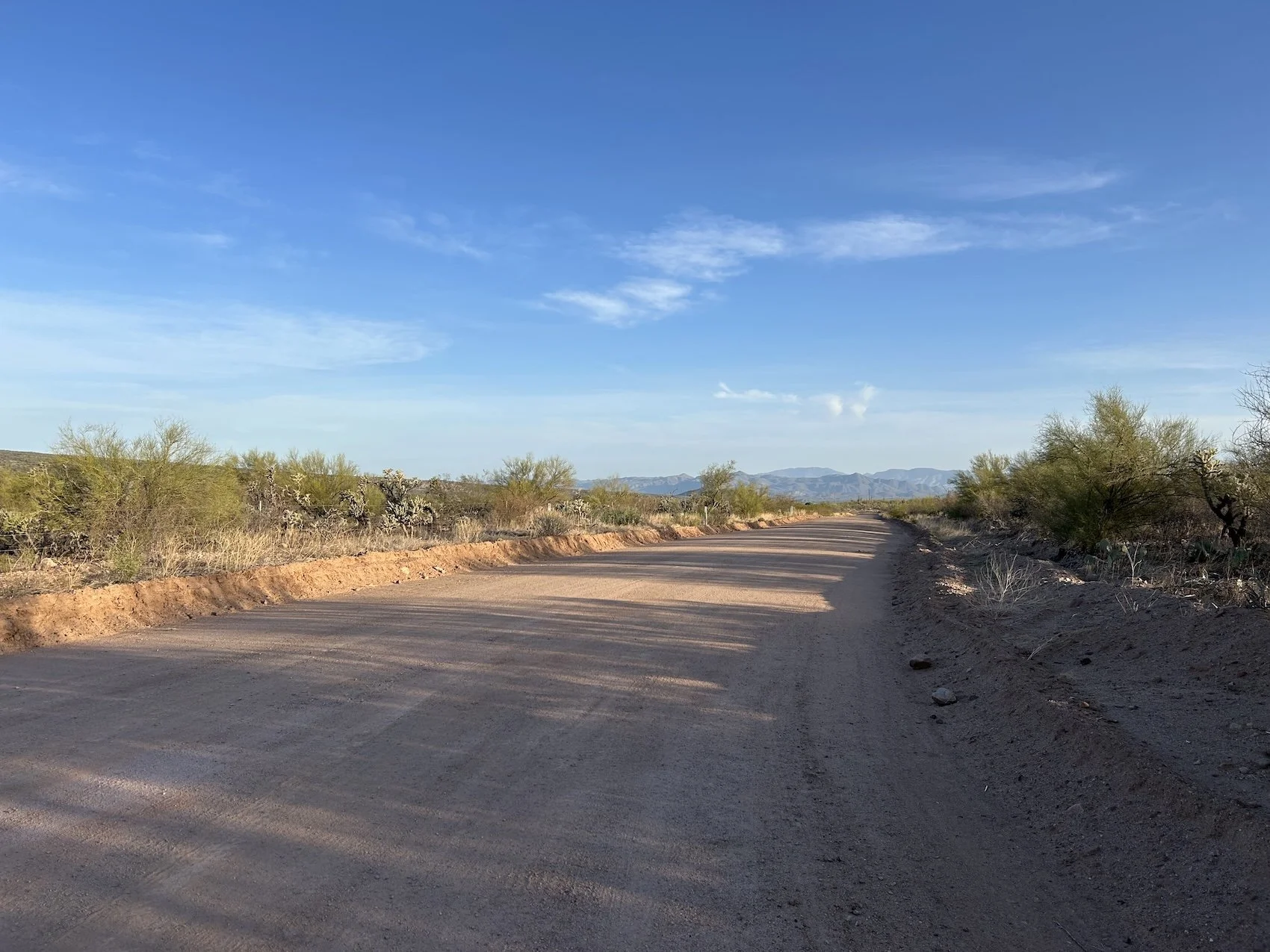 I joined a trail off the highway and relished in its unbelievable quality—it was well maintained! At last! I hiked past the burbling streams in Noon and Marjidilla Canyons, enjoying the relative smoothness of the trail and the open views. This trail would ultimately deposit me on a series of dirt roads through the desert basin in which Safford was situated.