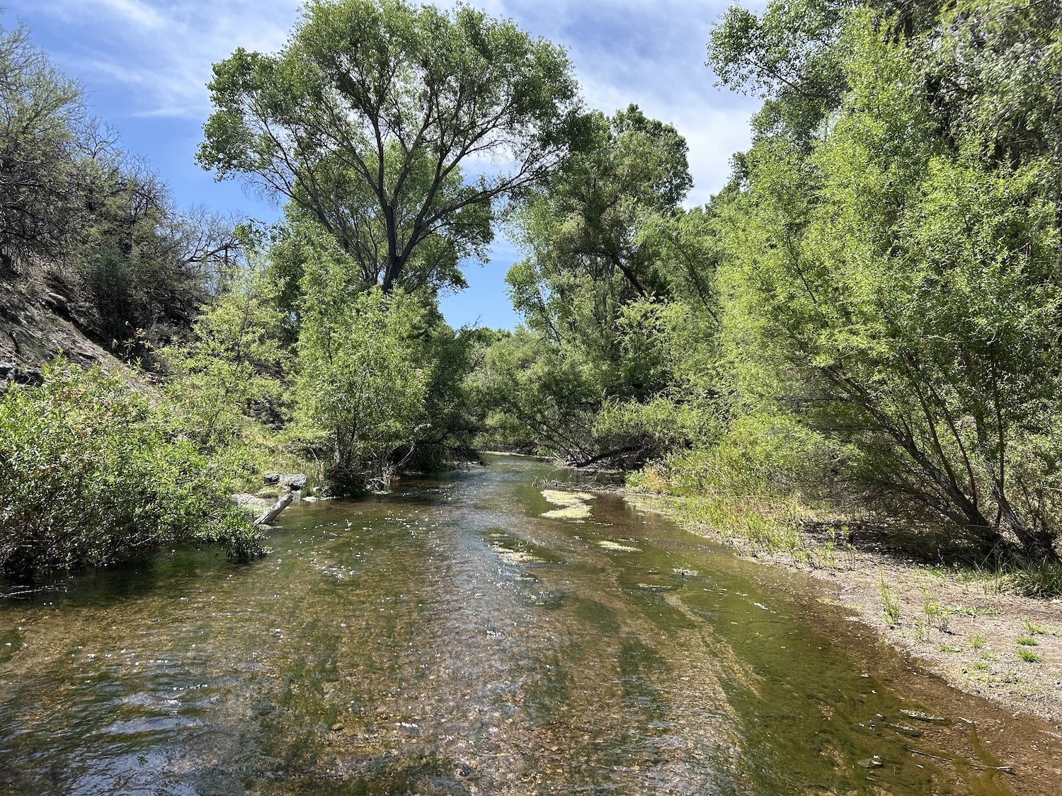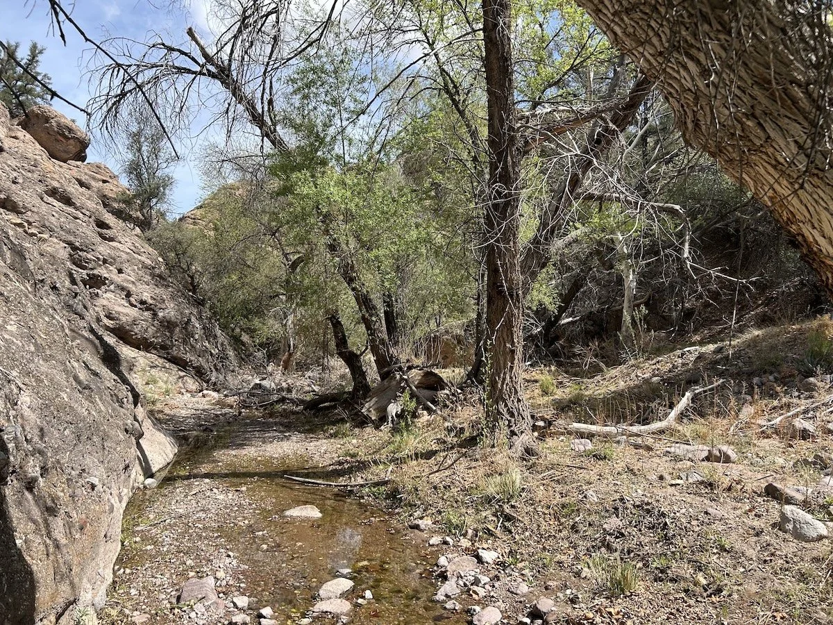 I hiked downhill through open desert until the trees enveloped me at the bank of the creek. The first thing I did was lay down in the water fully clothed. I felt the heat and stress of the day run off of me, carried away by the clear stream.