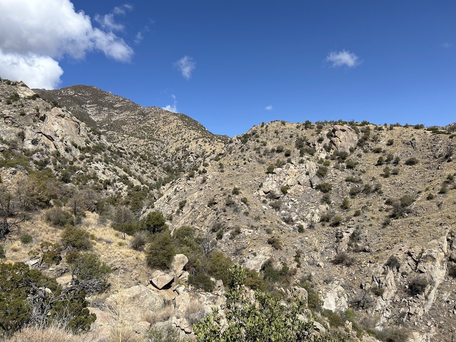 Then I followed an off trail route into the Pinaleños successfully and actually quite enjoyed it. It was a straightforward route up and over a steep ridge, studded with agave and cat claw and other vicious, thorn-coated vegetation.