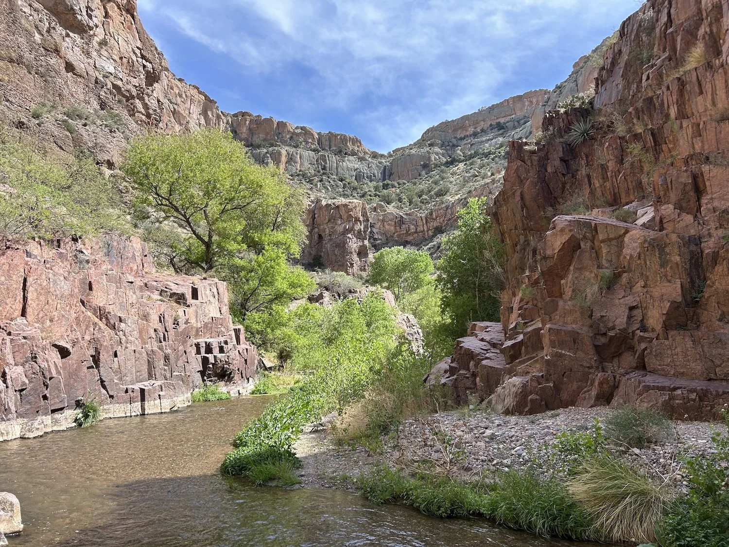 An amphitheater of red rocks and lush foliage along Aravaipa Creek