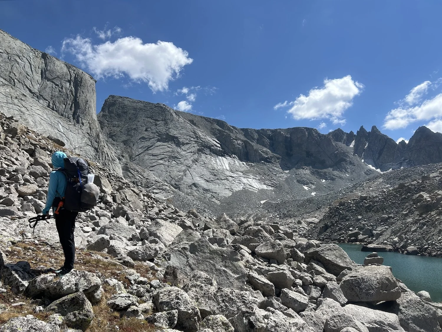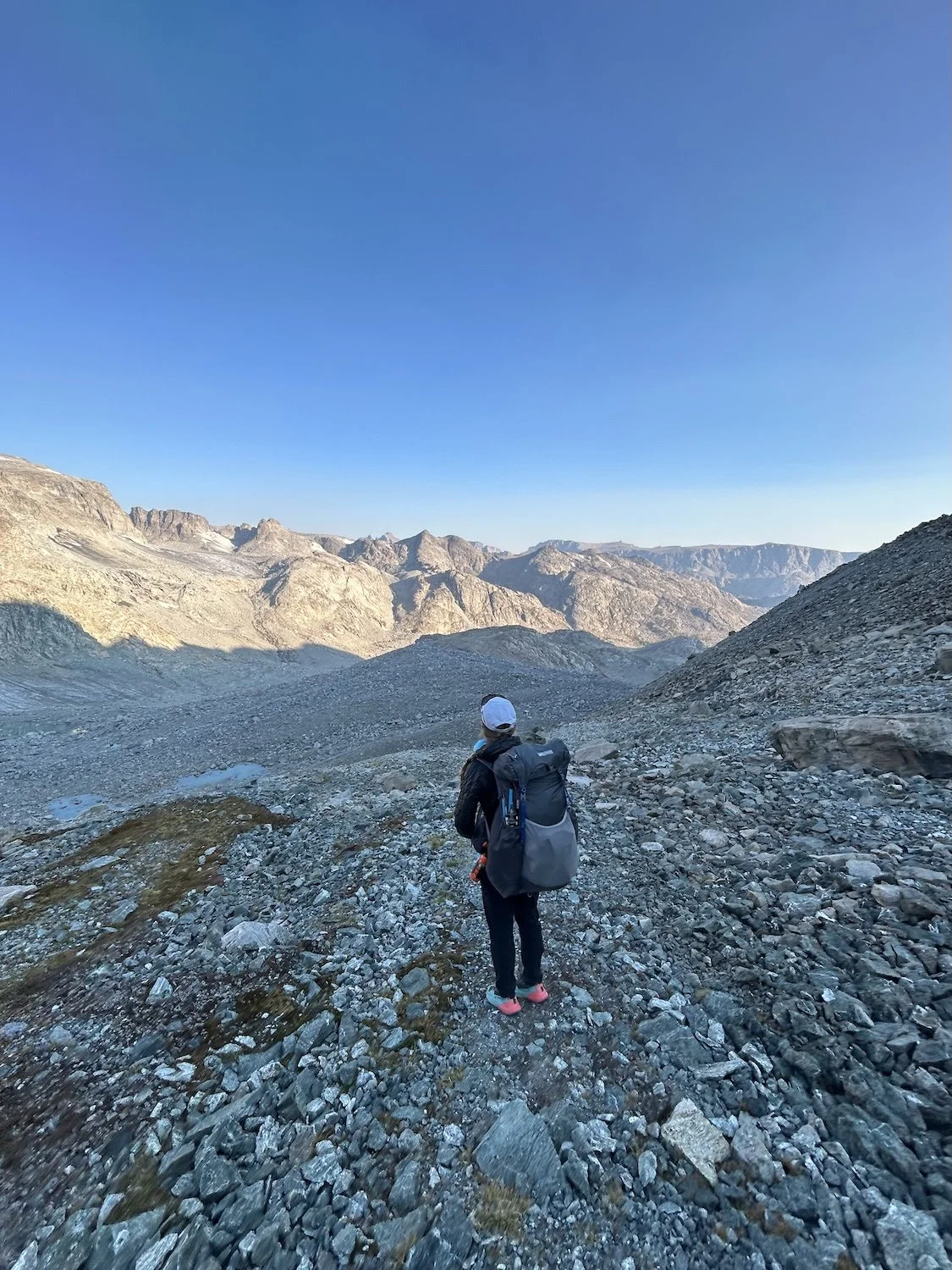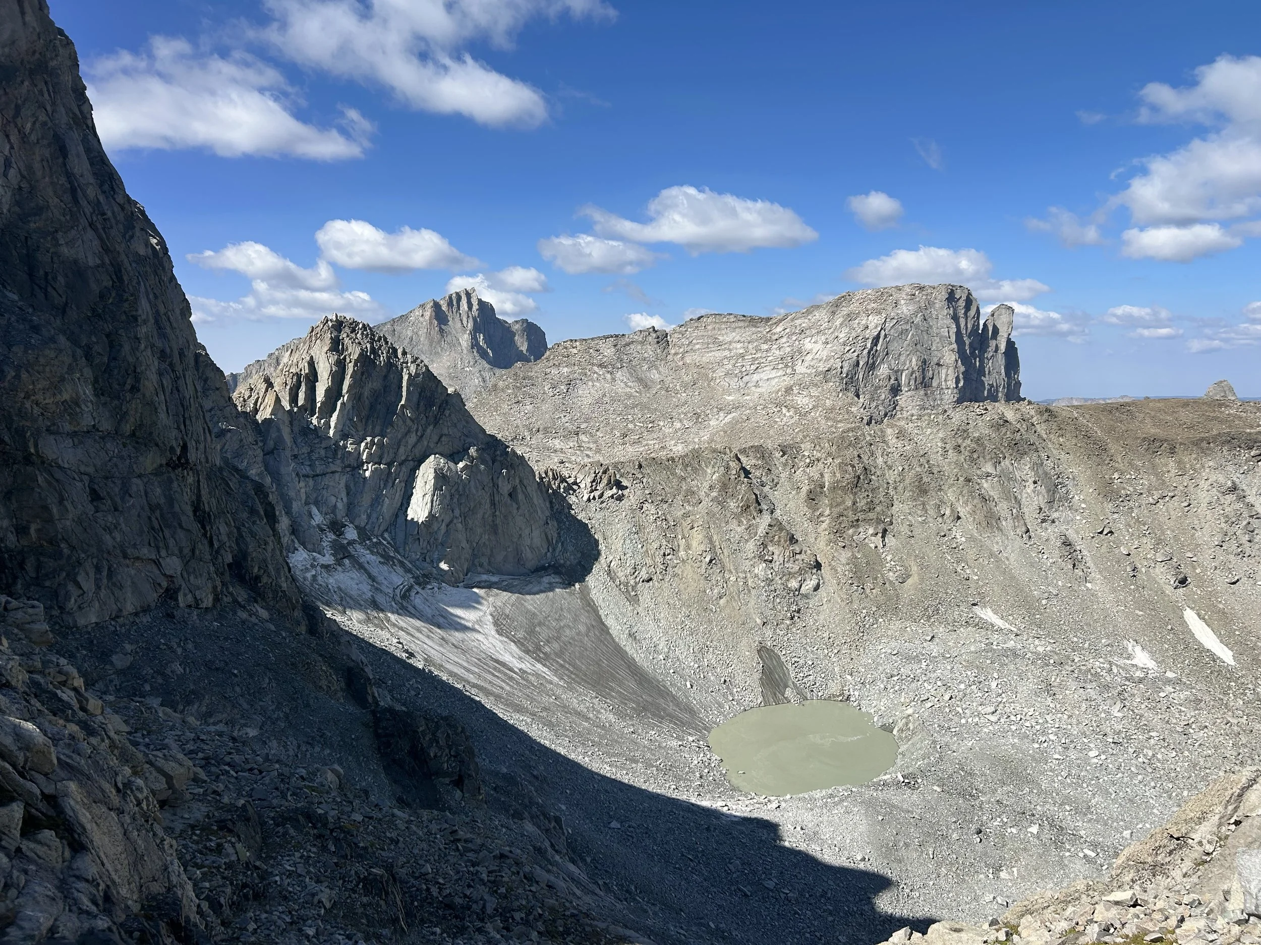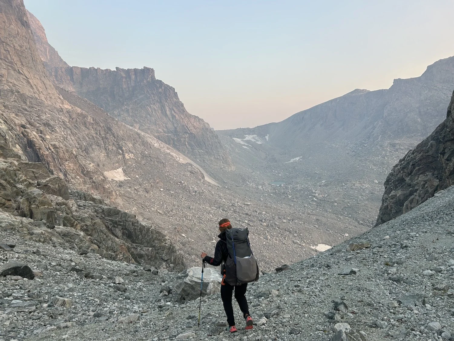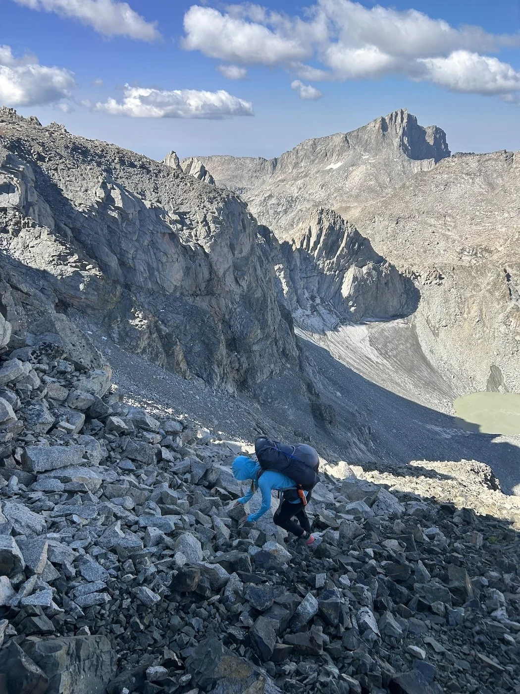 We carried eight days of food, which weighed heavily on us at the start, especially as we negotiated the class 3 downclimb in the West Gully off of Wind River Peak. From beginning to end, the way was fraught with nebulous moraine fields, loose scree, and boulders the size of cars. We utilized the waypoints provided by Skurka, his guidebook, and his annotated paper map set; we did not use a pre-established gps track and chose, instead, to do our own route-finding.