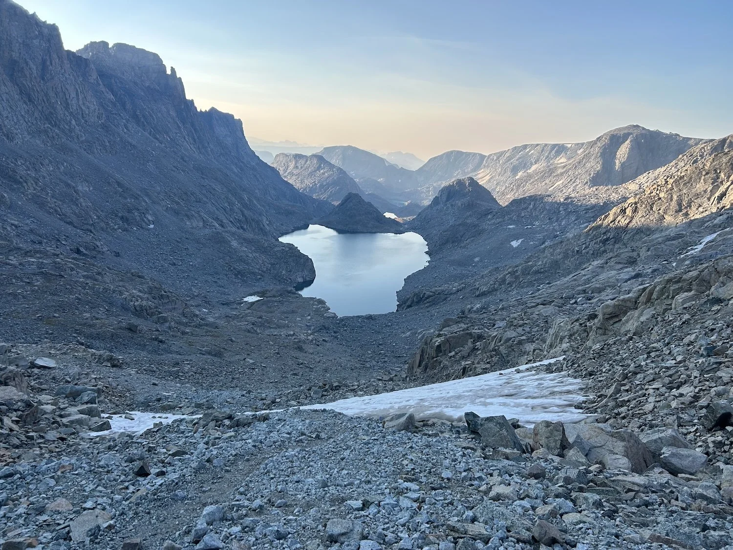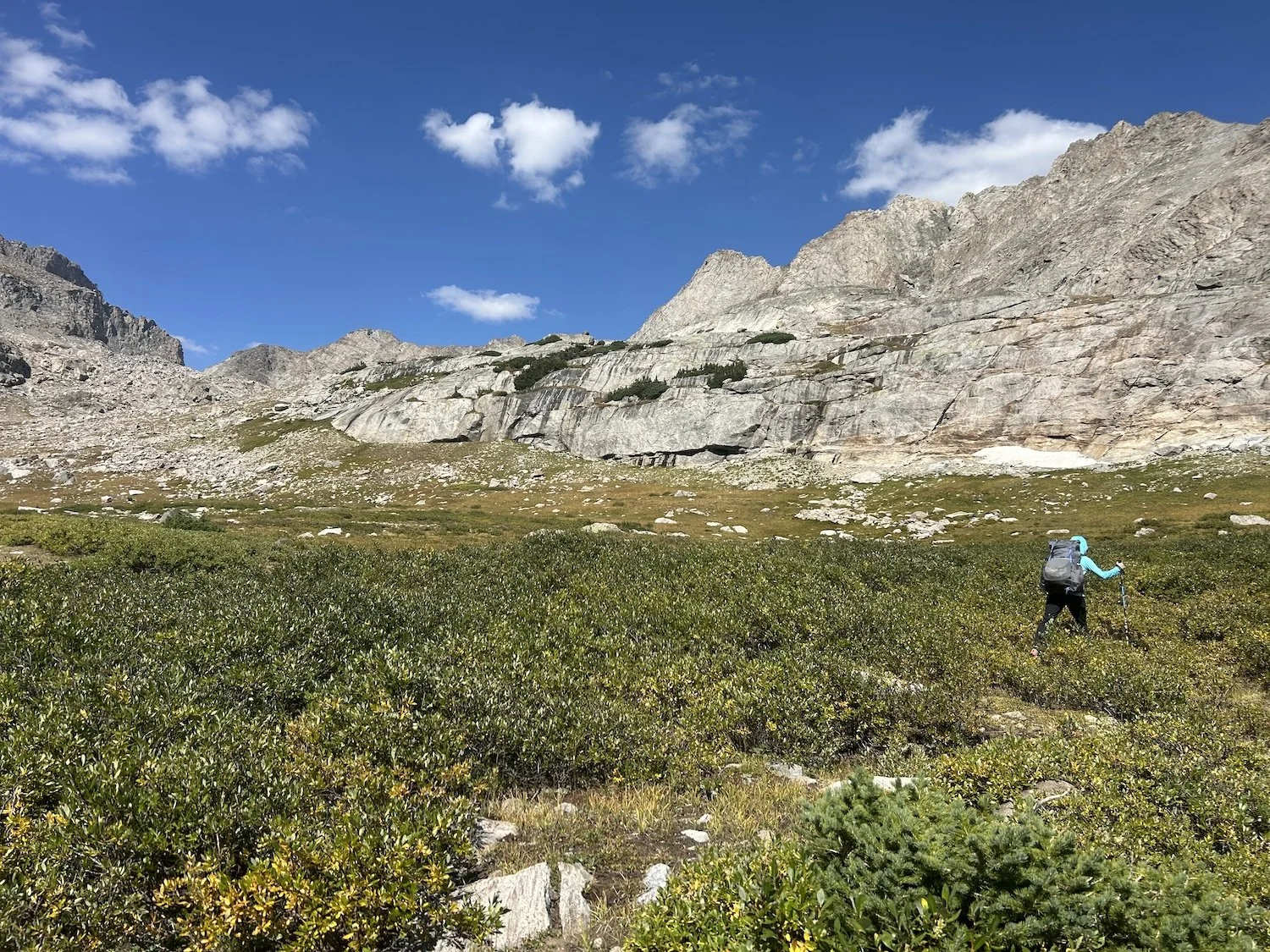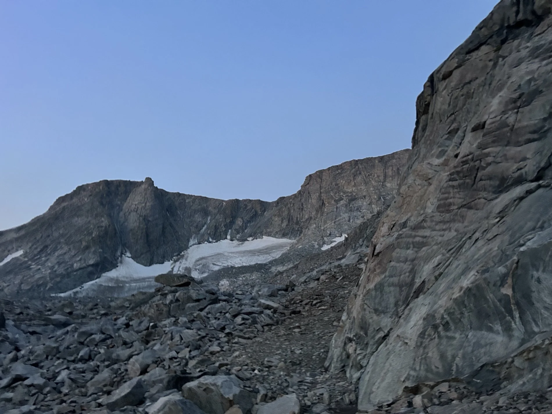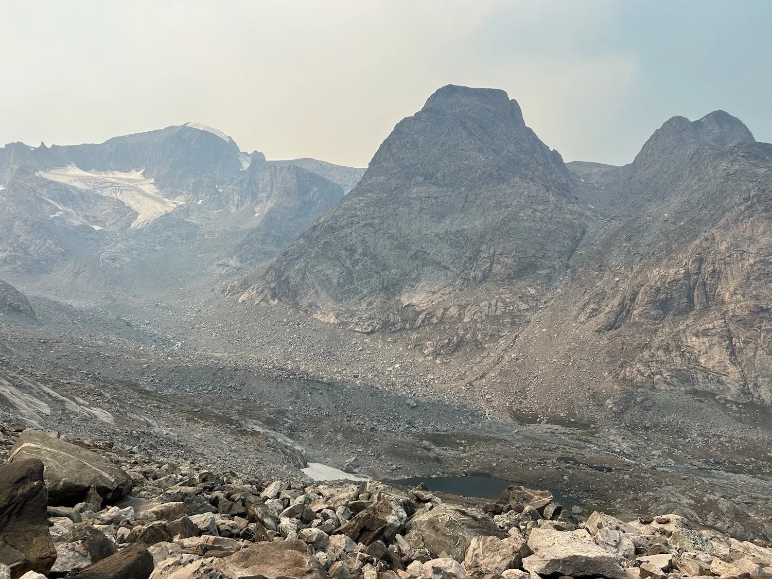 We carried eight days of food, which weighed heavily on us at the start, especially as we negotiated the class 3 downclimb in the West Gully off of Wind River Peak. From beginning to end, the way was fraught with nebulous moraine fields, loose scree, and boulders the size of cars. We utilized the waypoints provided by Skurka, his guidebook, and his annotated paper map set; we did not use a pre-established gps track and chose, instead, to do our own route-finding.