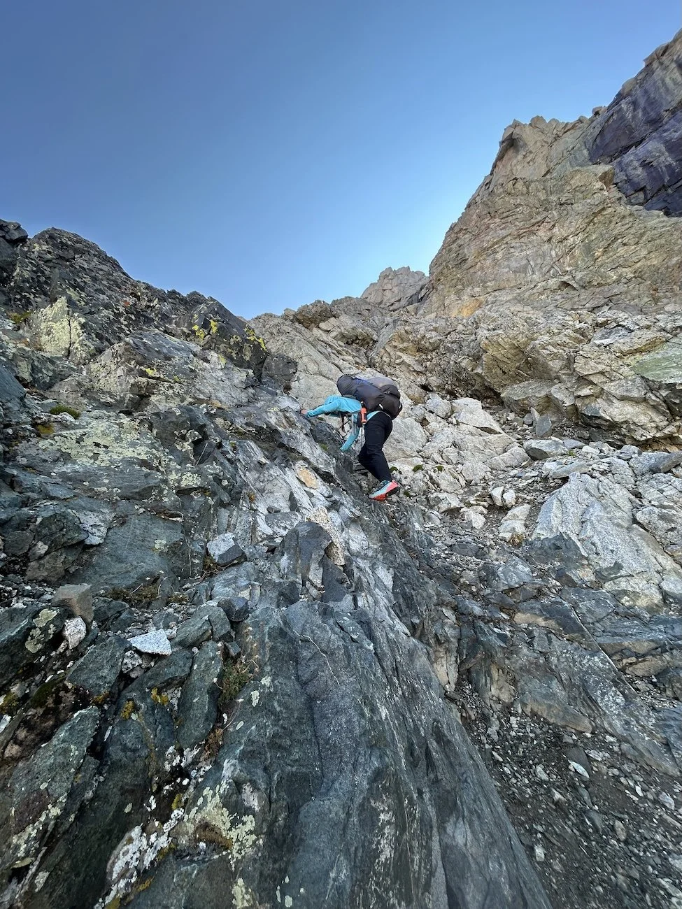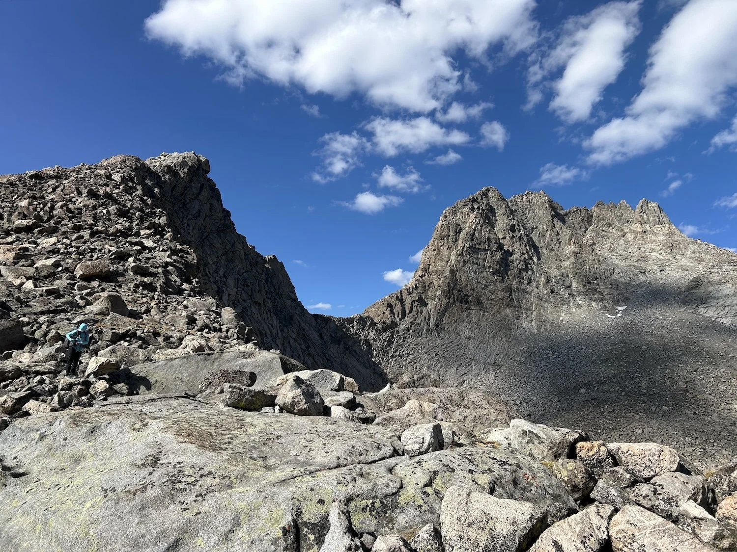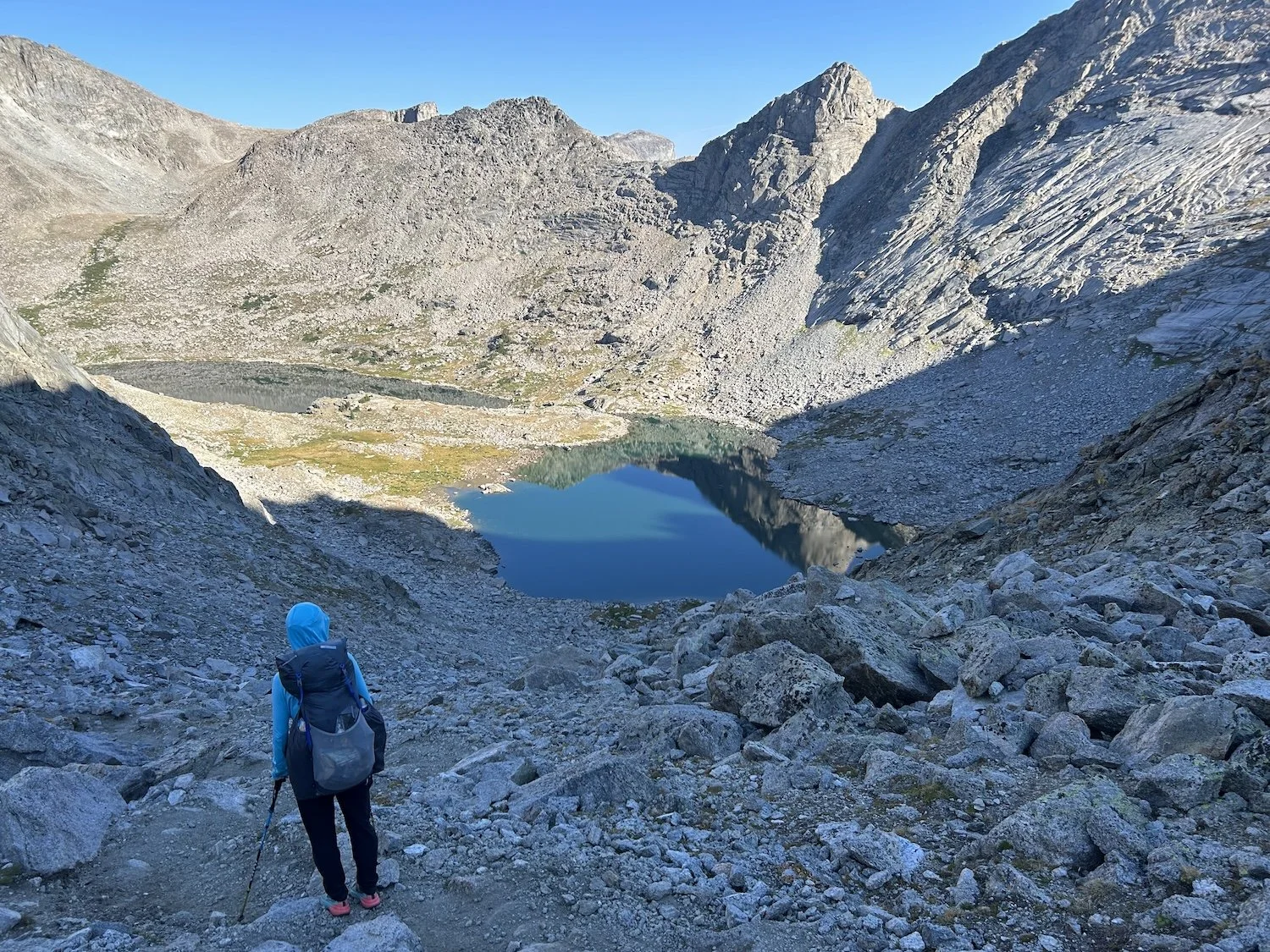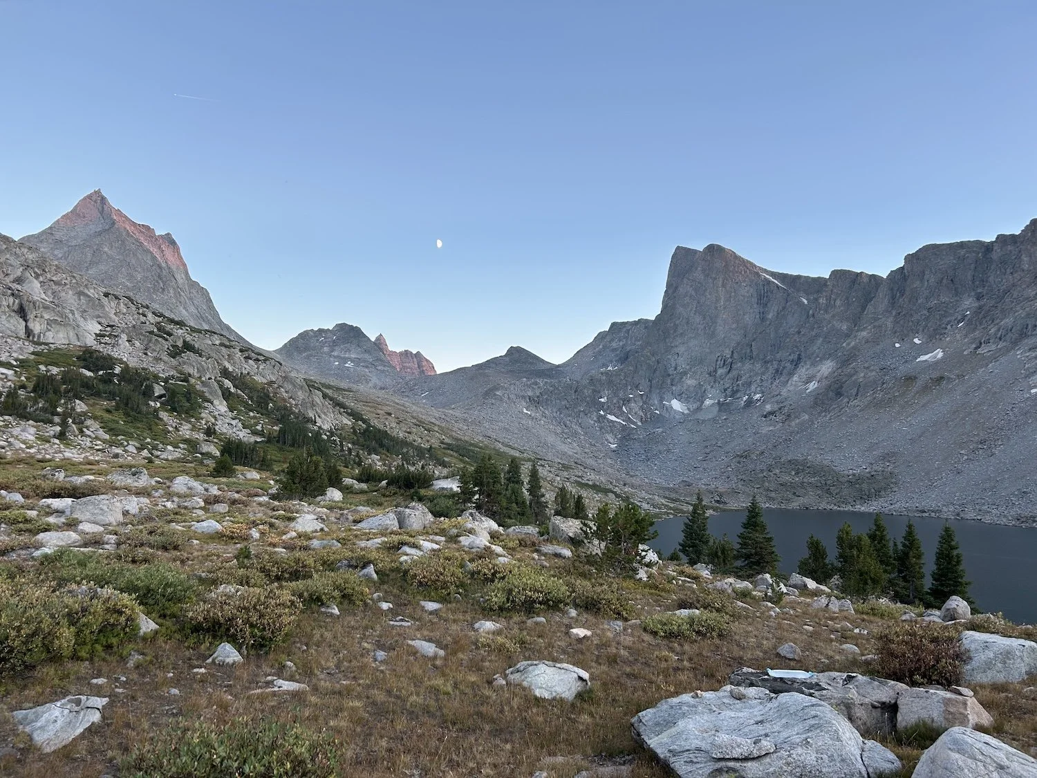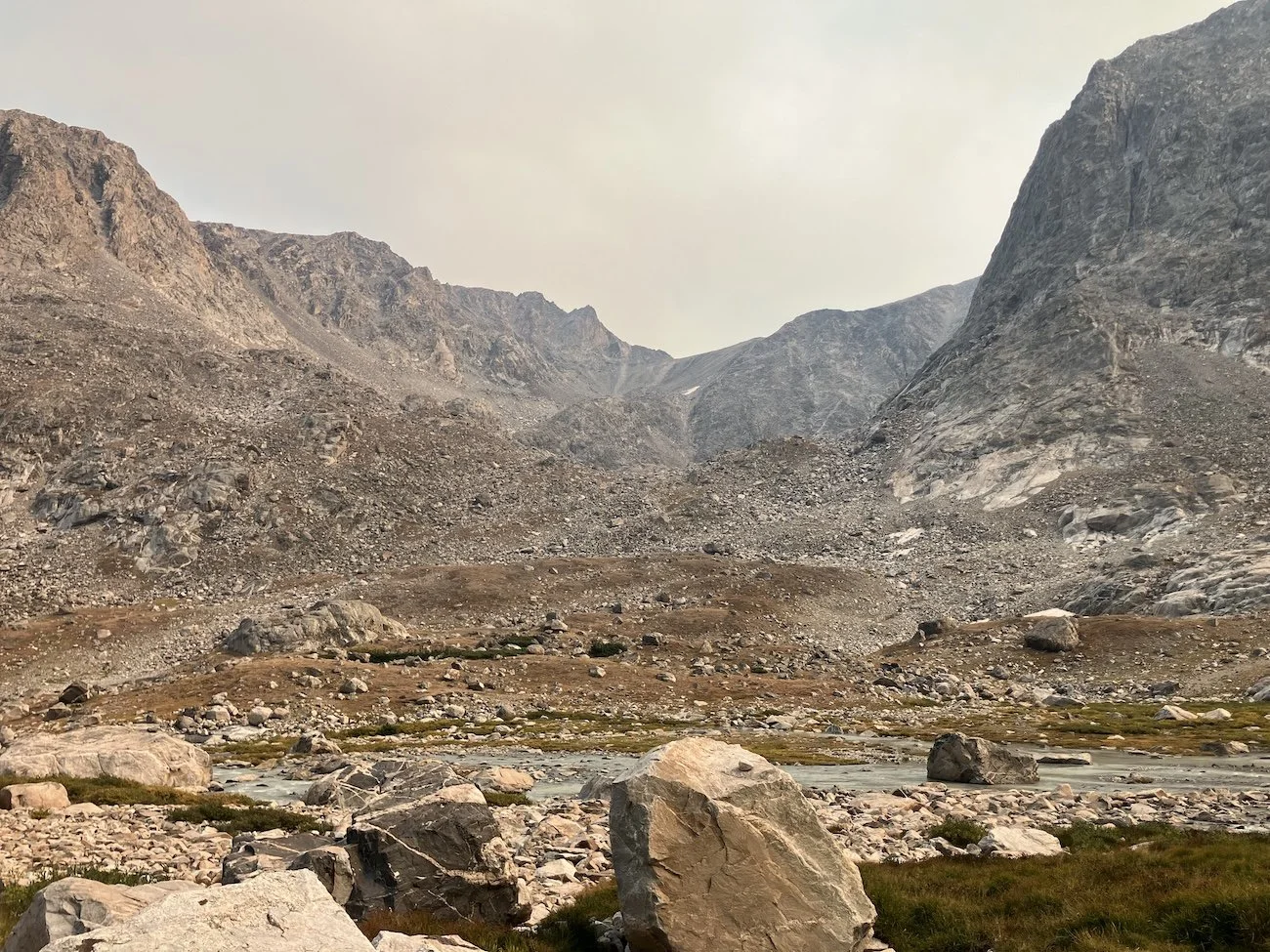 We carried eight days of food, which weighed heavily on us at the start, especially as we negotiated the class 3 downclimb in the West Gully off of Wind River Peak. From beginning to end, the way was fraught with nebulous moraine fields, loose scree, and boulders the size of cars. We utilized the waypoints provided by Skurka, his guidebook, and his annotated paper map set; we did not use a pre-established gps track and chose, instead, to do our own route-finding.