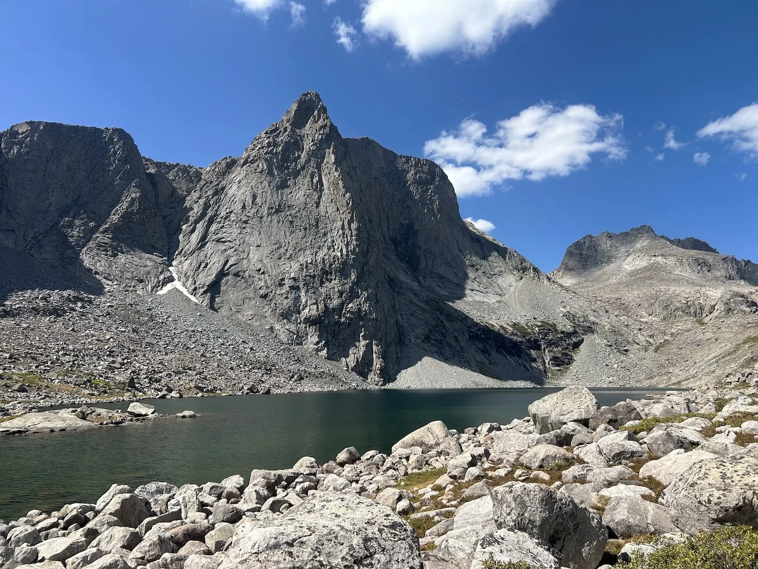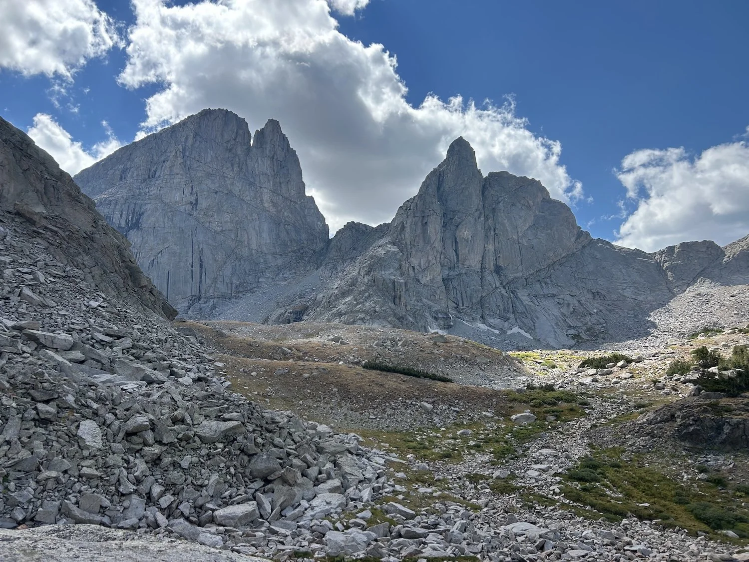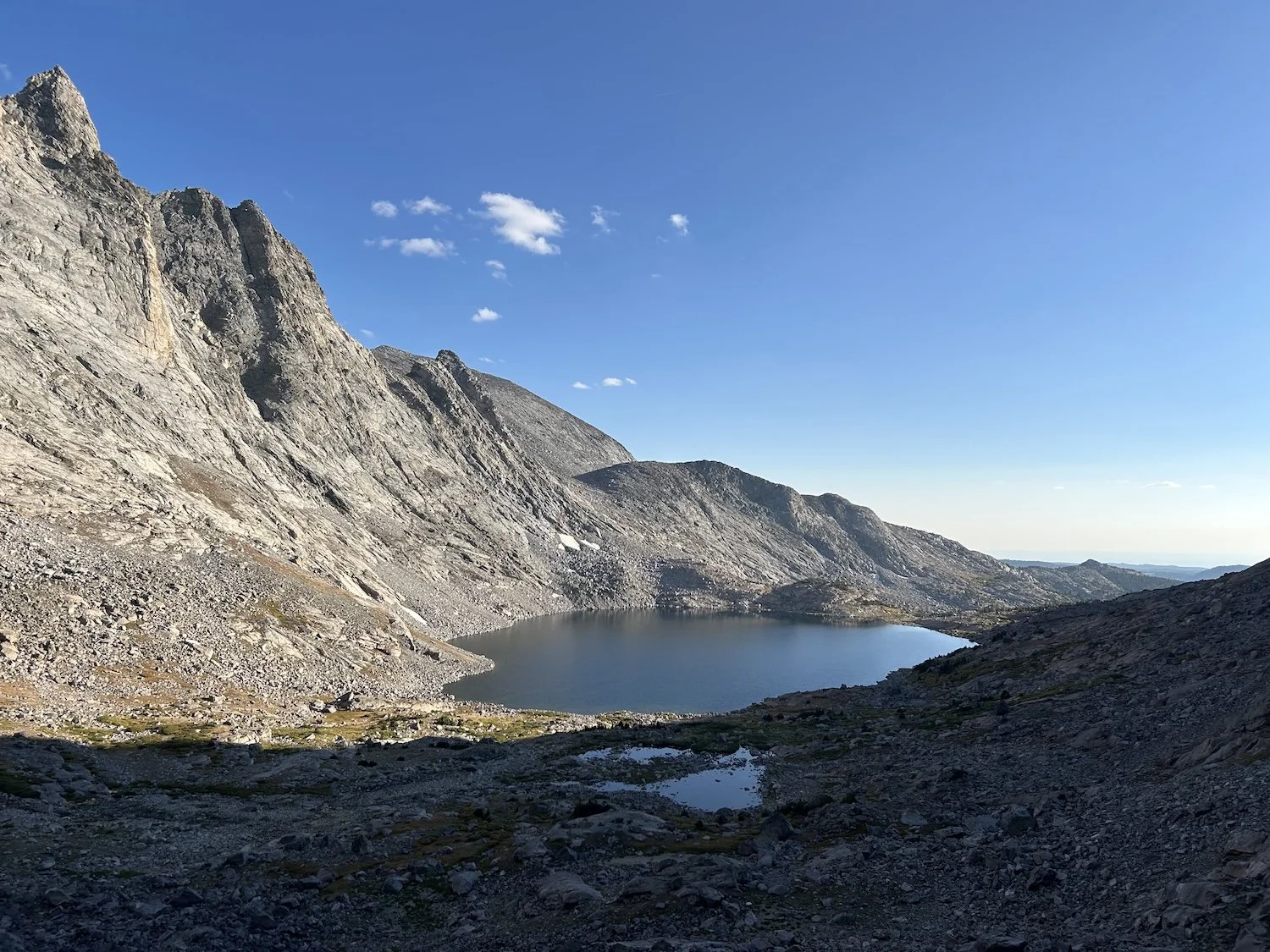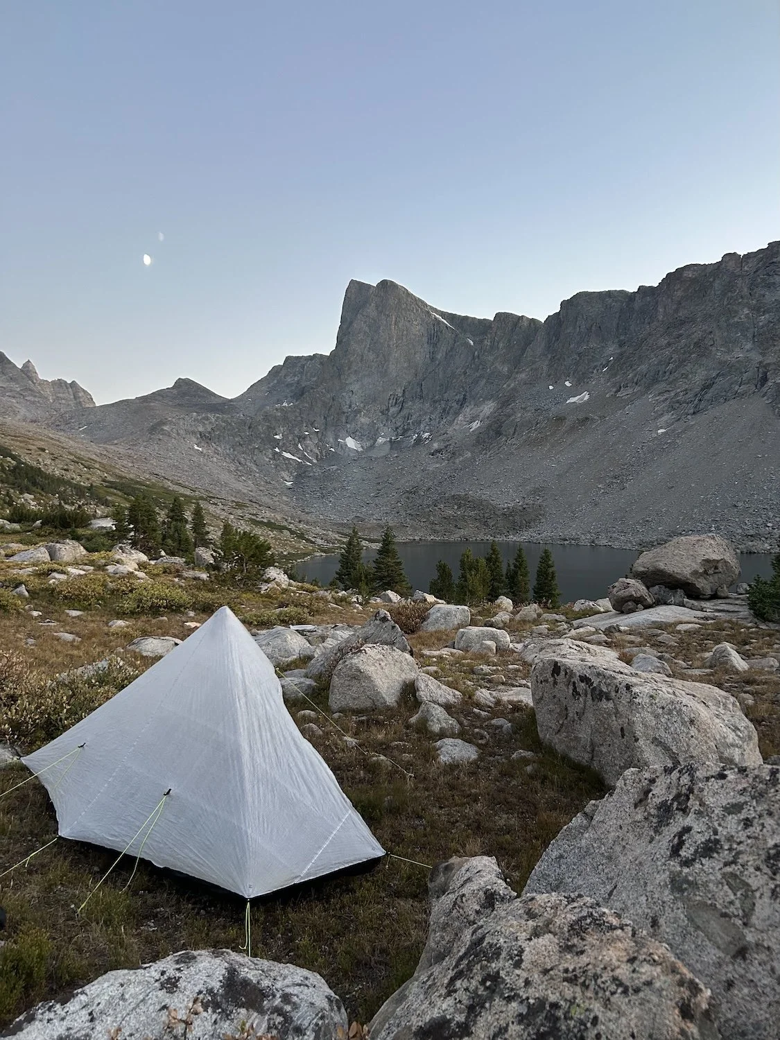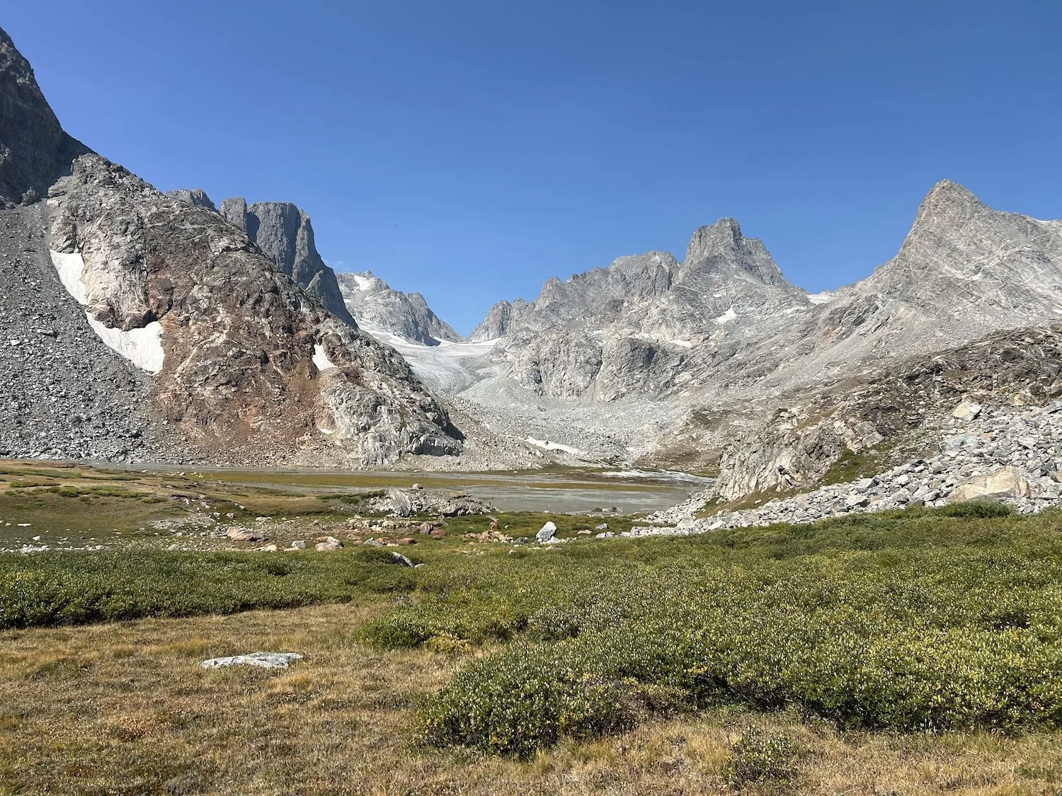 We carried eight days of food, which weighed heavily on us at the start, especially as we negotiated the class 3 downclimb in the West Gully off of Wind River Peak. From beginning to end, the way was fraught with nebulous moraine fields, loose scree, and boulders the size of cars. We utilized the waypoints provided by Skurka, his guidebook, and his annotated paper map set; we did not use a pre-established gps track and chose, instead, to do our own route-finding.