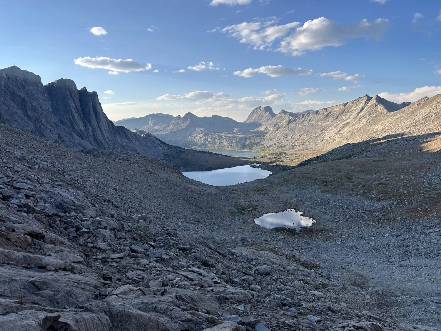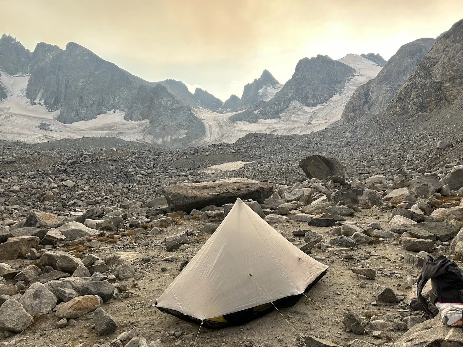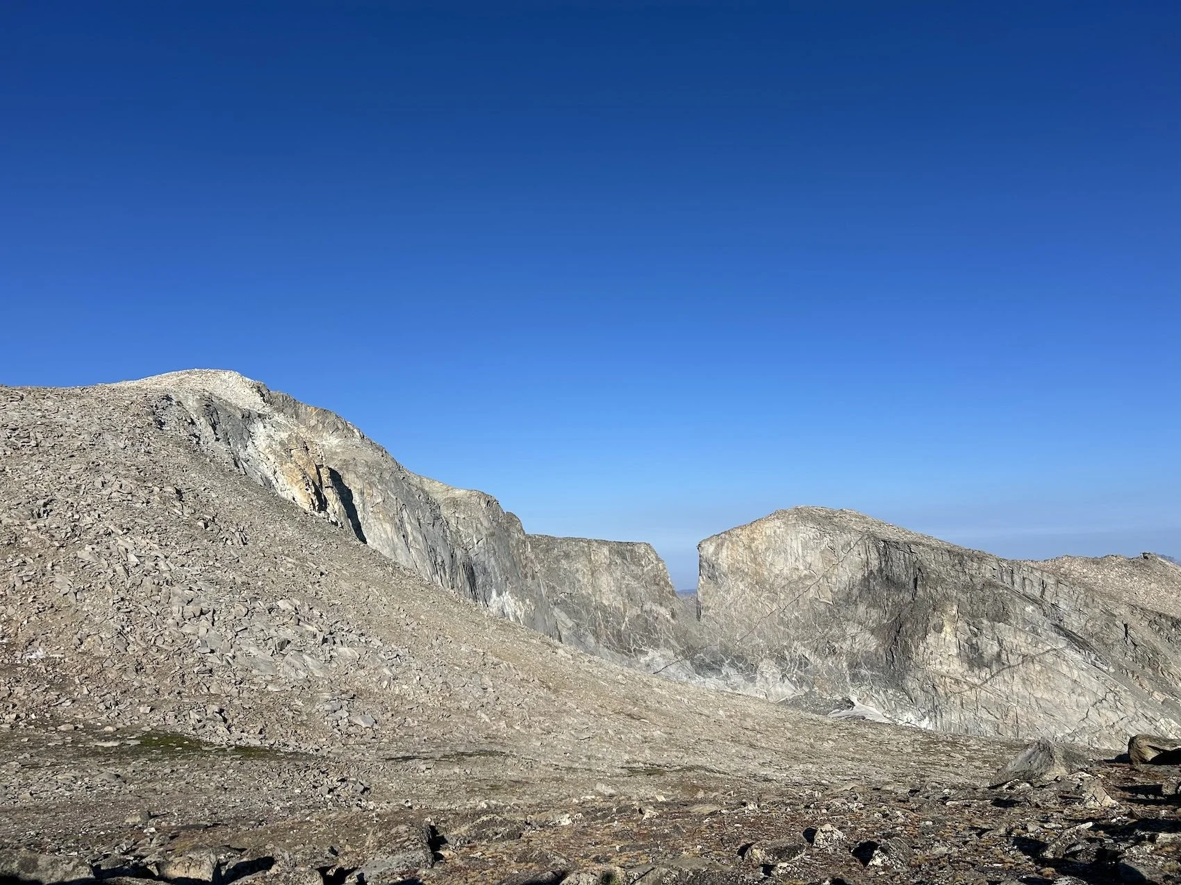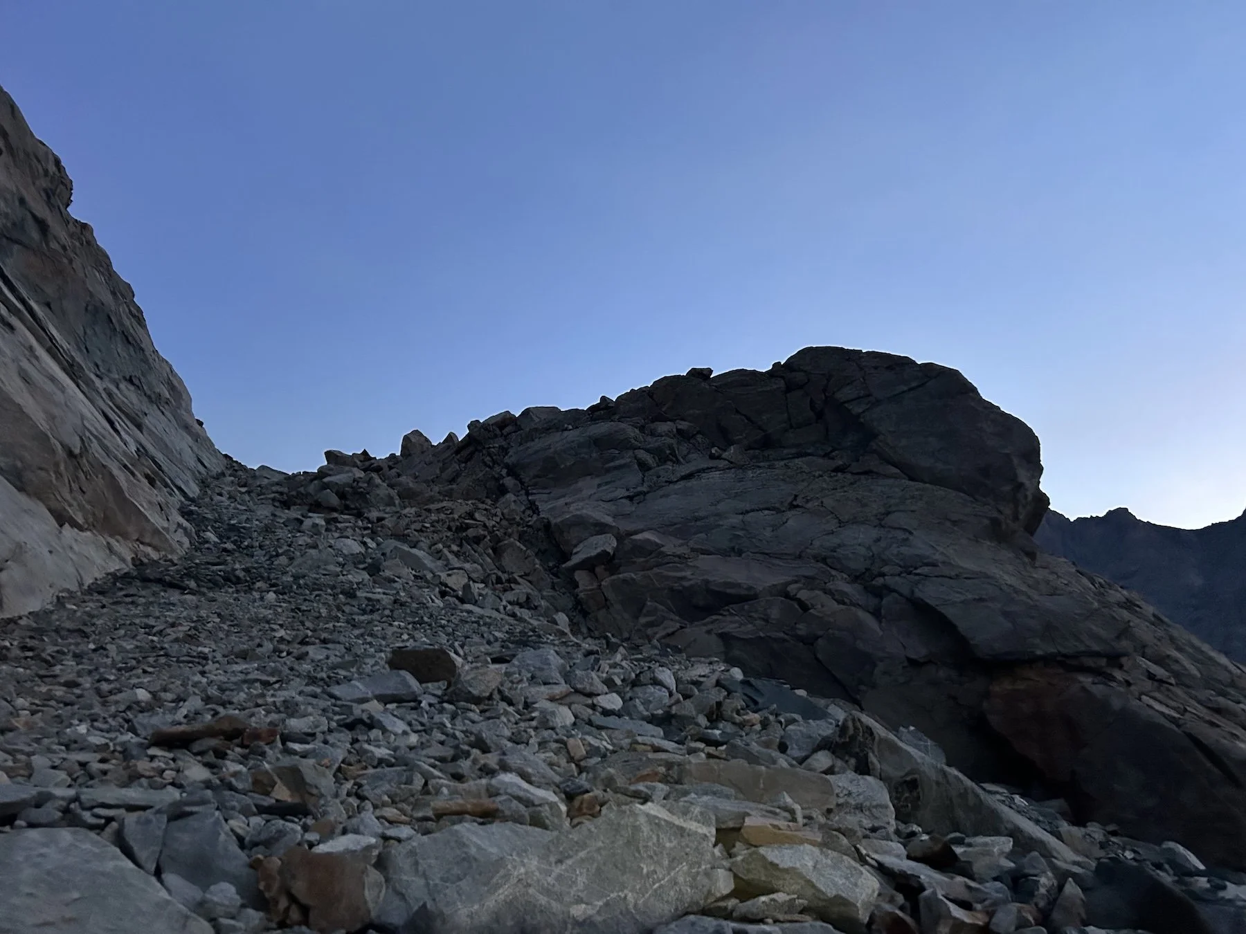 We carried eight days of food, which weighed heavily on us at the start, especially as we negotiated the class 3 downclimb in the West Gully off of Wind River Peak. From beginning to end, the way was fraught with nebulous moraine fields, loose scree, and boulders the size of cars. We utilized the waypoints provided by Skurka, his guidebook, and his annotated paper map set; we did not use a pre-established gps track and chose, instead, to do our own route-finding.