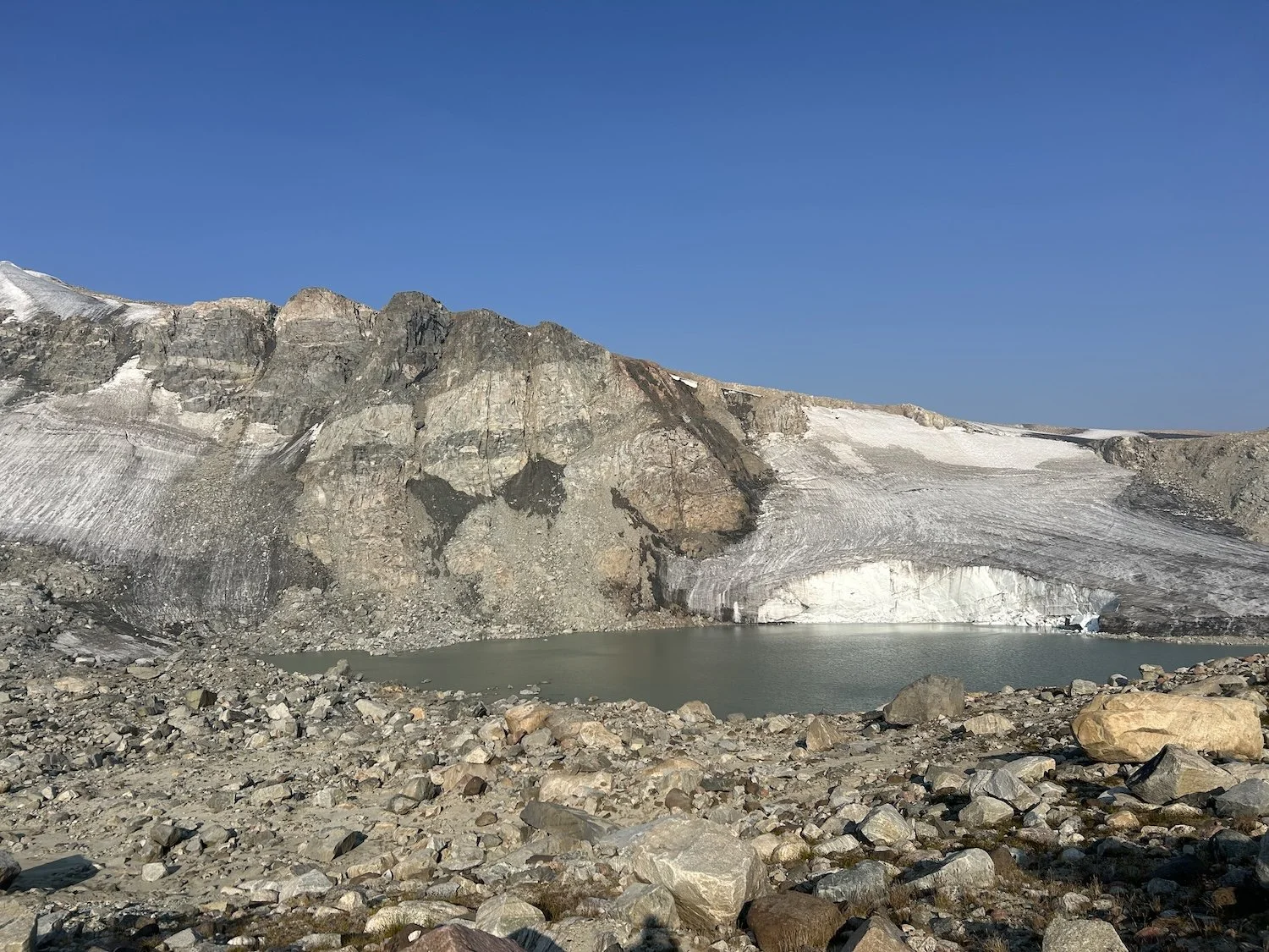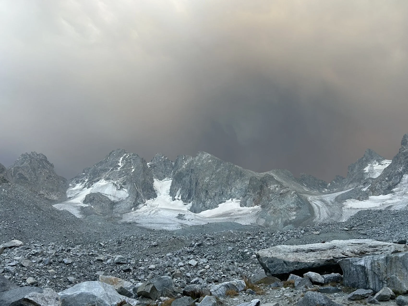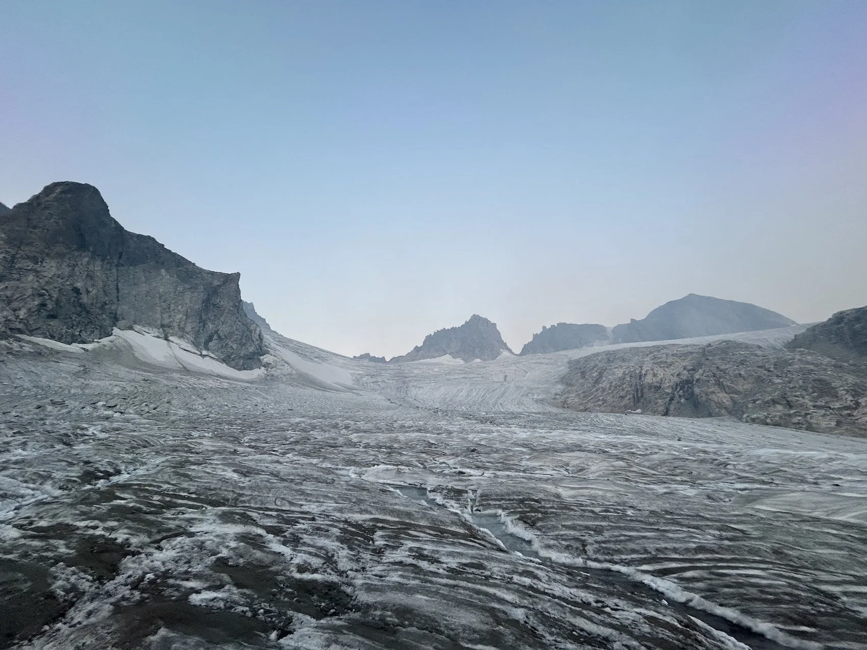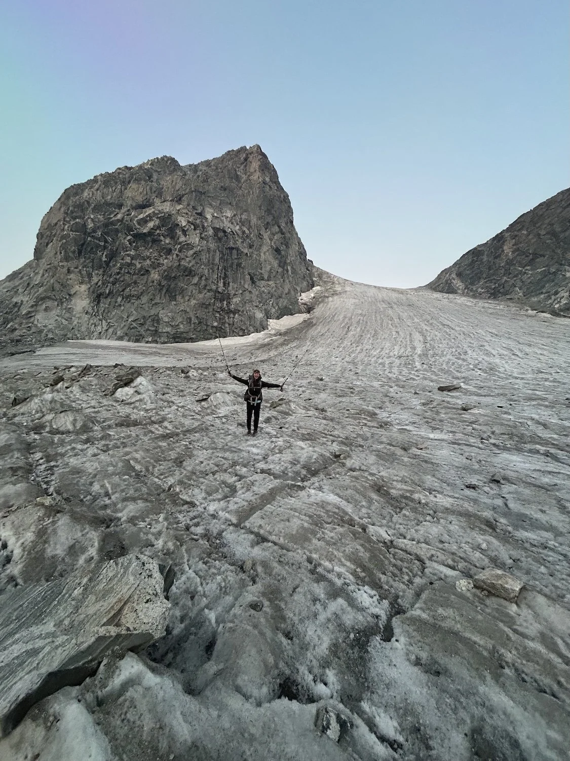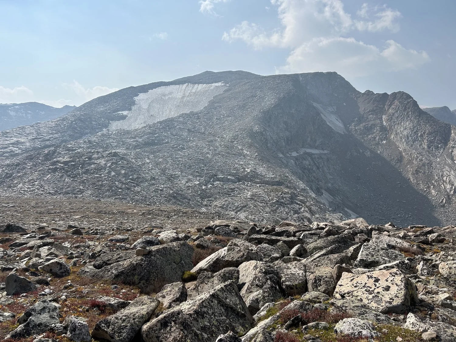 We carried eight days of food, which weighed heavily on us at the start, especially as we negotiated the class 3 downclimb in the West Gully off of Wind River Peak. From beginning to end, the way was fraught with nebulous moraine fields, loose scree, and boulders the size of cars. We utilized the waypoints provided by Skurka, his guidebook, and his annotated paper map set; we did not use a pre-established gps track and chose, instead, to do our own route-finding.